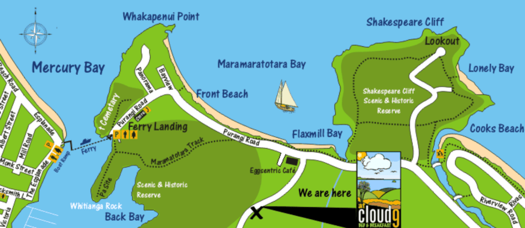 SHAKESPEARE CLIFF BUSH WALK Allow 2-3 hours (dogs on leash) You can catch the ferry from Whitianga to “Ferry Landing”, from here you can walk through the bush to Shakespeare Cliff, via Whitianga Rock (Pa Site) and Maramatotara track which is to the right when you get off the ferry. Or if you want to be quicker you can walk to the Shakespeare Cliff track via the road. You can then walk down to Lonely Bay and Cooks Beach if you wish to. To walk back you can just follow the road back to Ferry Landing.
