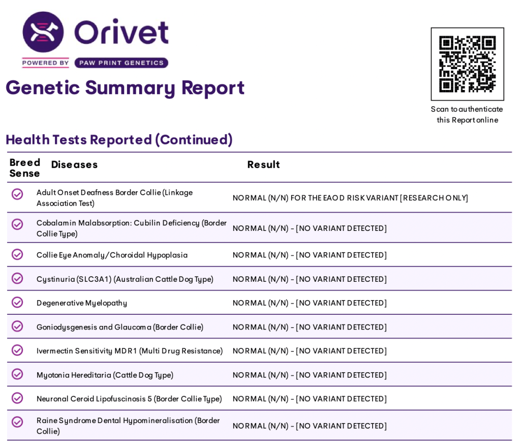 Blaze came back clear of all tested genetic diseases, providing peace of mind for both me and future puppy owners.